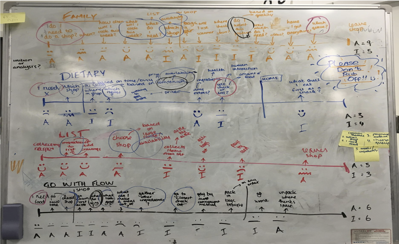 After interviewing people about their shopping experience, we created journey maps that would convey the key parts of each person's decision-making process. Using these journey maps, we applied and evaluated three human-decision making models (OODA loop, Vroom-Yetton-Jago and Recognition Primed Model). From this, we found that the Recognition Primed Model was most relevant, although we did incorporate parts of the other models in our final solution.